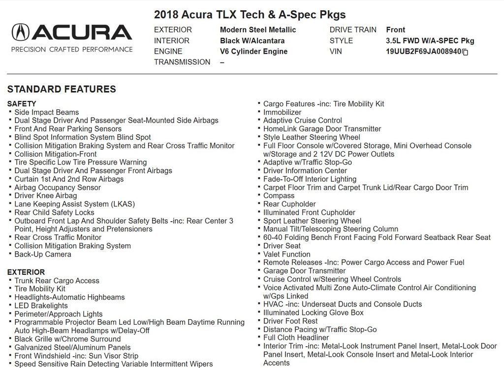 2018 Acura TLX 3.5L V6 w/Technology & A-Spec Packages