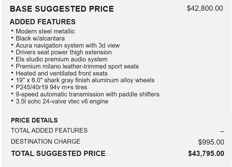 I knew I would like this car a lot before I got it, but i like it more than that. The cars I've driven and/or owned that beg for comparison are: 2006 Accord EX-L, 2012 Acura TSX 2.4L Tech, 2015 Accord V6 Touring, 2006 Honda S2000, which I just sold to buy this car. The TLX offers so much of what's great about an Accord--though not the full interior room; if you want a full mid-size sedan, this isn't one--but with the premium/luxury treatment. I have not driven the current Accord, so I cannot speak to that, but I can say that the TLX delivers superior driving dynamics, ride and handling balance, and quietness over a 2015 Accord V6 Touring (my mom's car), and also over the 2012 TSX we leased new for three years. Those reviewers who have noted that the TLX improved on all of the TSX's shortcomings are absolutely right. This thing is dialed-in. The 8-speed DCT, which was one of the big draws for me, helps a lot. But they also improved all other aspects of the driving experience. The safety tech is there, but not obtrusive. It has adaptive cruise, which I wanted. The ELS Studio surround system is still excellent. I will point out that, since this car has Android Auto/Apple Carplay compatibility, they have stripped out a lot of the functionality of the on-board voice command and navigation systems from what you got back in 2012. That makes sense, given that most drivers will use Auto or Carplay most if not all of the time. But it's worth noting for those Acura fans who got used to the Zagat ratings or the full suite of voice commands of earlier models ("Temperature Max Cold!") The two-screen infotainment layout works great; your navi is going up top, your audio and climate below. The lower touch screen is much better than the system in my mom's 2015 Accord Touring, which is similar if not identical to the previous TLX's. As for the drive, this is a perfect car for asking the question "why do you need more than this?" For those of us who drive on U.S.. roads at legal speeds, I can't see why more power would be helpful. I'm coming out of an S2000, and while this car won't carve an off-ramp at that car's level, for what the car is, it does great. I would not put up with a FWD sedan with torque steer or noticeable understeer during normal driving. Both the '12 TSX and the '15 Accord V6 had torque steer at hard launch. This car does not. (I suppose P-AWS helps here, but Honda has other tricks too.) The interior is not opulent; it's nice. The materials are all nice and nicely put together. Those looking for the kind of "wow" in the cabin that a current Mercedes has or a Jaguar has will not find it here. Those who appreciate understated, basic quality and what you need where you need it (quality perforated leather, quality pleather, soft-touch plastics) will be happy. The fake wood looks good, and there is real aluminum trimming the upper center stack. NVH is seriously suppressed; my wife and I think the car compares neck-and-neck to our 2014 Lexus GX460 Luxury in that department. Fuel economy is going to be a big plus with this for commuting and short road trips, but putting in Sport or Sport Plus is also a nice option for having some fun. We bought this car CPO from an Acura dealer with just under 32K on it, flawless condition, for $25,500 out the door. That's so much car for that money. I will update this review on reliability once we've owned it for a while. - 4.0