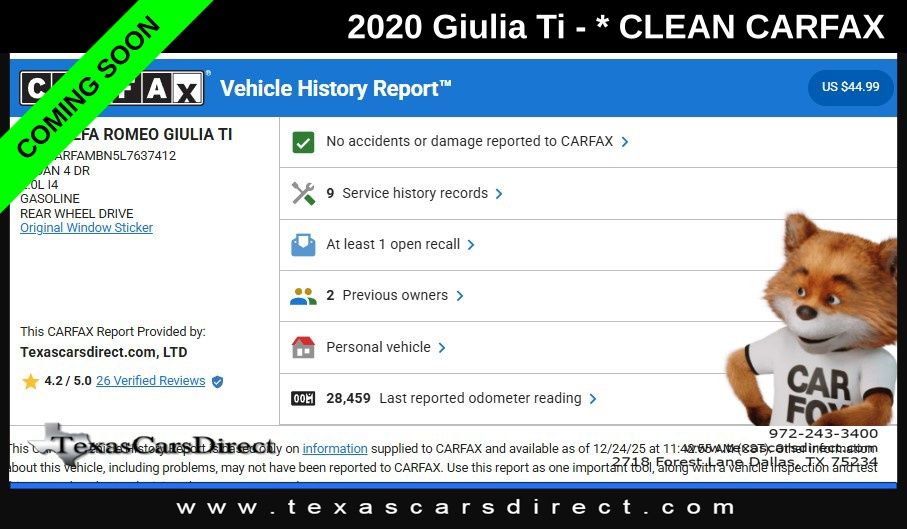 2020 Alfa Romeo Giulia Ti Clean Carfax/Blind Spot/Apple