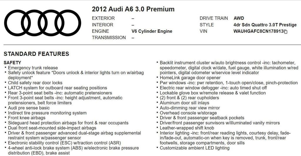 This 2012 Audi A6 3.0T Prestige, has Dakota Gray Metallic exterior and Black interior color. 124,385 miles. Stock Number 178913. You can connect with us by calling 972-243-3400.