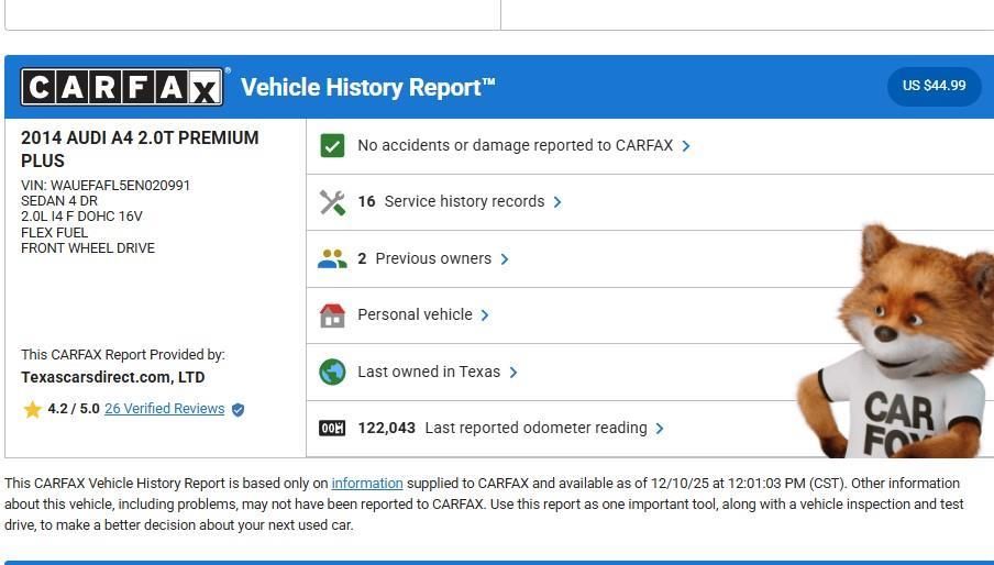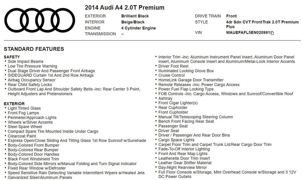 This 2014 Audi A4 Premium Plus, has Brilliant Black exterior and Beige/Black interior color. 122,609 miles. Stock Number 020991. You can connect with us by calling 972-243-3400.