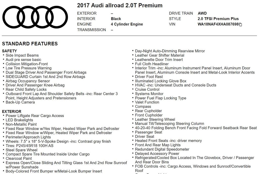 With its stunning design, impressive performance, and comprehensive suite of premium features, this 2017 Audi A4 allroad 2.0T Premium Plus QUATTRO is the perfect choice for the discerning driver. We invite you to experience the exceptional quality and craftsmanship of this exceptional vehicle.