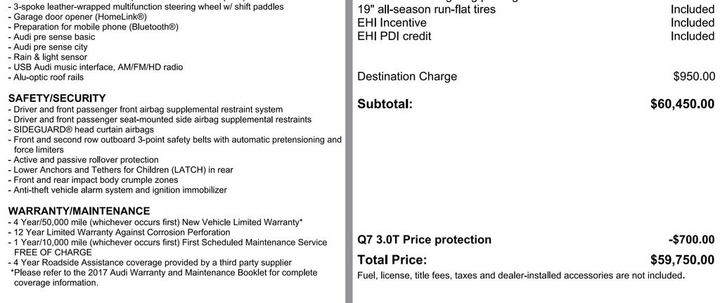 Overall I have been pleased with my Q7, but I would suggest that any potential buyer invests in time-consuming due diligence to truly understand what is necessary for the maintenance of a performance vehicle. I experienced loud brake squeaking around 15,000 miles and was told that I would most likely need to replace in the span of a few months. At 20,000 miles I have been advised that my tires and brakes need to be replaced. This is very common amongst Audi and the Q7. It is a critical missing piece to truly understand the cost of ownership and I think it is important for the consumer to know. Other than that, the Q7 fits my needs offering a usable third row without the large size. It is somewhat generic interior is unimpressive. The technology within is fun, and like most new things, can be glitchy at times. Overall it is reliable. - 5.0