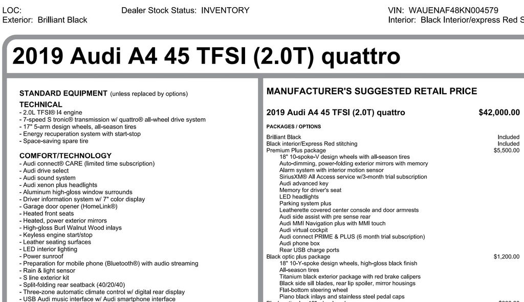 2019 Audi A4 2.0T Premium Plus Quattro/Apple/Black Optic+/Sport