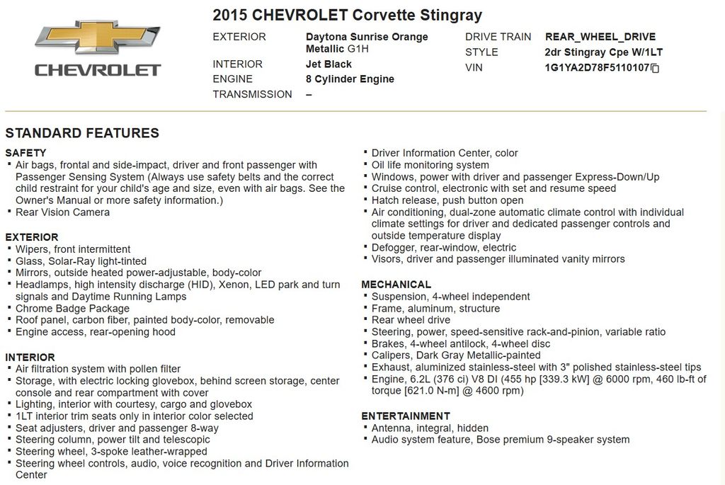 Indulge in the thrill of the open road with this stunning 2015 Chevrolet Corvette Stingray 1LT COUPE MANUAL. Boasting a head-turning Orange exterior and a powerful 6.2L V8 engine mated to a 7-Speed Manual transmission, this Corvette is the perfect blend of style and performance.
