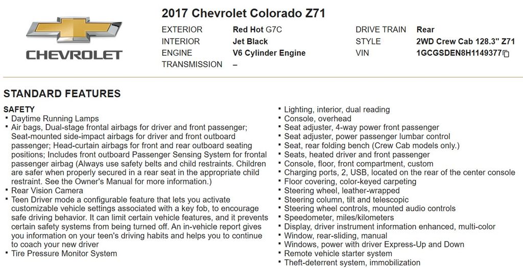 I decided to trade in my baby, a 10 Camaro SS/RS, for a 17 V-6 Z71 Colorado 4X4, which also allowed for the sale of my 02 Tracker winter driver. Once everything shook out - one insurance policy as opposed to two, very low mileage on the trade-in, military discount, etc., Ive got net payments of 200.00 for 60 months, on a brand-new kick-butt vehicle that gets a LOT of compliments. Laser Blue Metallic is a fantastic color. I didnt want a Silverado -- too much for me. Just needed something to tow my Coleman camper a few times a year and do some occasional cargo hauling, and this is perfect...Extended Cab, by the way - just me & the dog. The back seats are more for holding grocery bags than people. If you need them on a regular basis, opt for the Crew Cab. Great ride, but the solid rear axle does remind me on occasion (when gunning it on a turn over rough pavement) that it IS a truck. Seats are perfect for me (5ft 10in, 170#), and the power lumbar and multi-option seat heat are a improvement over my Camaro. My only dings on Comfort & Convenience is WHY did GM not put heated mirrors as standard across the board??? It seems they have corrected this for the 18 models. And my Infotainment system occasionally does not see my USB drive (stuffed with tunes) -- I have to turn the vehicle off, pull the key, & open the door. Upon restart all is well. ??? 8-speed transmission shifts well for the most part, upshifting in about a 1,000 RPM band under light to moderate acceleration. I get 24.5 MPG highway, and about 17.5 city - and I dont baby it. - 5.0