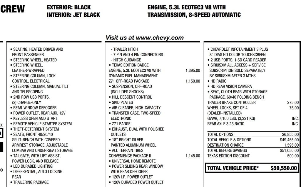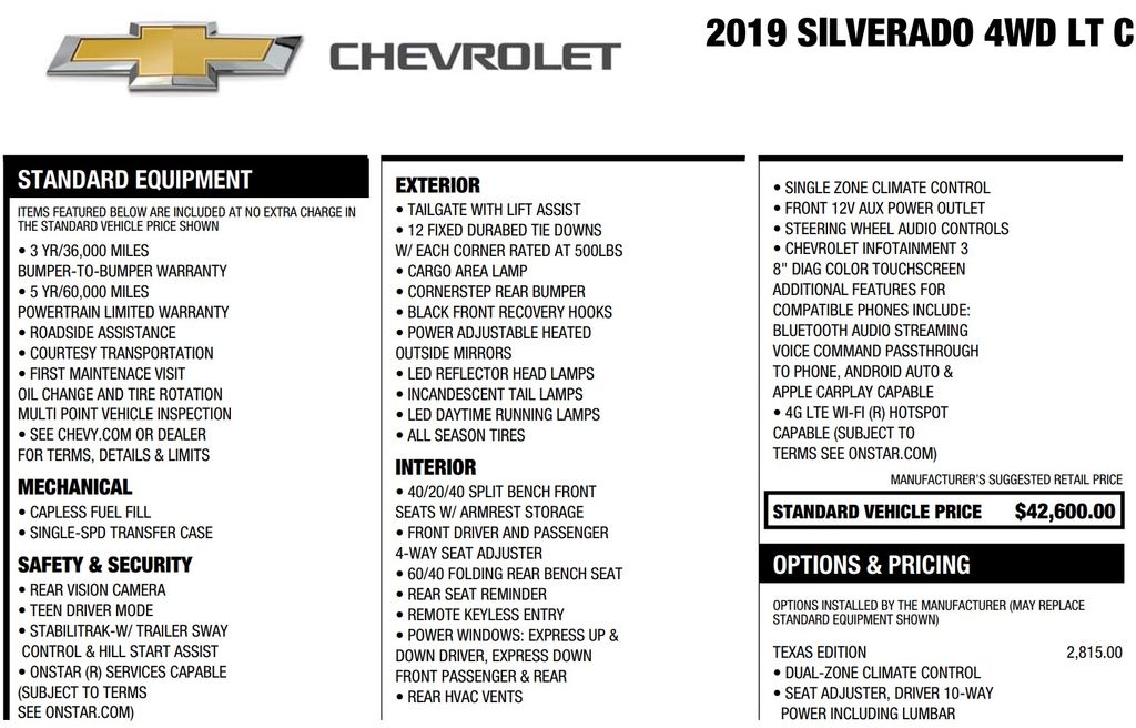 I traded up from a 2017 (which was already a great truck!) to a 2019 and wow what an improvement! I have the 5.3 with 8 speed tranny, which is smooth shifting, super quiet ride, etc, etc. Chevy as the controls and buttons all figured out nicely for easy of use. The backseat of this crew cab is even bigger than the previous model; its so big the kids can almost play football back there. Definitely another great value from Chevy. Minor irksome points include the goofy tilt/telescoping steering wheel. The previous model had a simply stalk that allowed easy up/down but the 2019 uses a goofball 'Japanese style' system, which is ery annoying and cumbersome to use. Also missing the ashtray (not for smoking but for storing small items like trailer keys, chapstick, and stuff). Also, they took away the third cup holder in the front/center, which is also annoying since I always have two different drinks while my passenger also has her own. But everything else is awesome and absolutely love this truck!