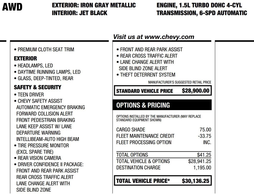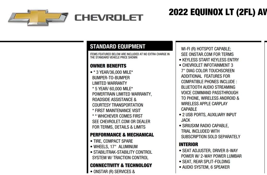 The Equinox LT is equipped with a 1.5L DOHC engine and 6-speed automatic transmission, delivering a smooth and efficient ride with an impressive 25 city / 30 highway MPG. Enjoy the confidence of all-wheel drive, enhanced by features like the 4-wheel independent suspension, traction control, and electronic stability control.