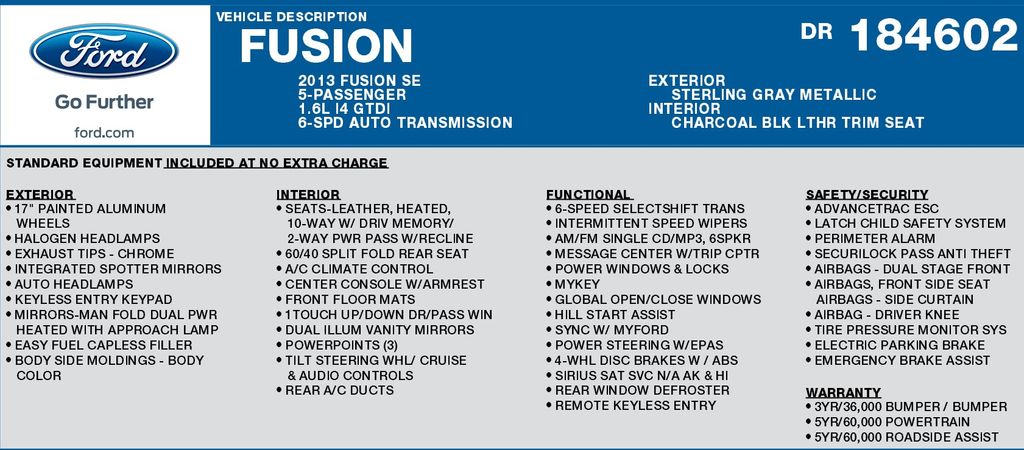 The Ford Fusion SE Luxury Package boasts an impressive array of advanced technologies, including the SYNC voice-activated communications and entertainment system, dual-zone electronic automatic temperature control, and a rear video camera for seamless parking. The EcoBoost 1.6L I4 engine delivers an exceptional blend of power and efficiency, with an EPA-estimated 23 city/36 highway mpg.