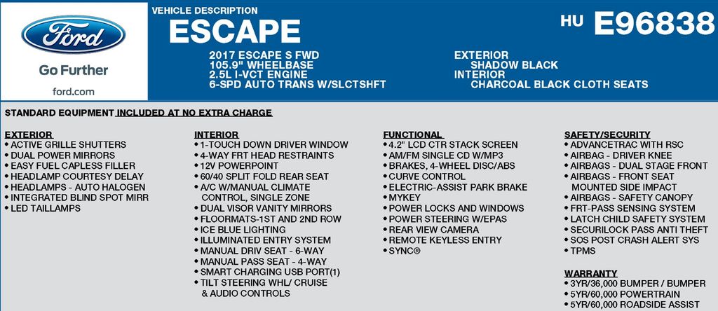 Discover the perfect balance of style, efficiency, and practicality with this 2017 Ford Escape S. Boasting low mileage, a backup camera, and an impressive 29 MPG on the highway, this SUV is ready to take you on your next adventure.