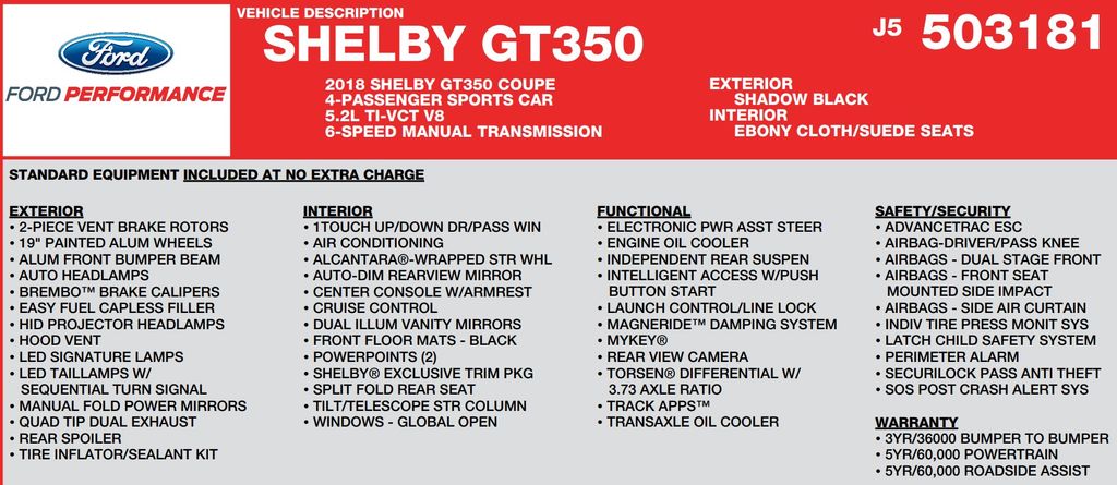 Elevate your driving experience with the Shelby GT350's advanced performance features, including an adaptive suspension, high-intensity discharge headlights, and Brembo brakes. The RECARO cloth/Miko Suede sport seats provide exceptional support and comfort, while the universal garage door opener and dual-zone automatic climate control add to the vehicle's exceptional level of refinement.