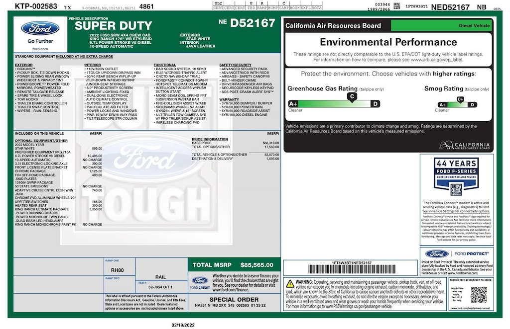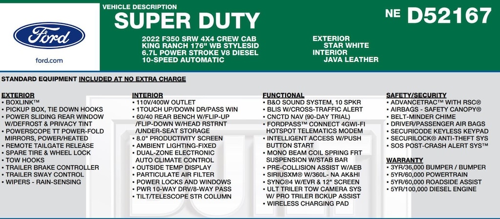 ENGINE: 6.7L 4V OHV POWER STROKE V8 TURBO DIESEL B20, ORDER CODE 710A, ELECTRONIC-LOCKING W/3.31 AXLE RATIO, KING RANCH ULTIMATE PACKAGE, FX4 OFF-ROAD PACKAGE, HEATED REAR SEATS, ADAPTIVE CRUISE CONTROL & COLLISION WARNING, UPFITTER SWITCHES (6)