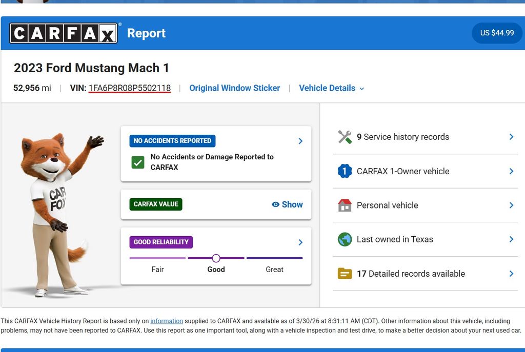 Prepare to be captivated by the sheer power and precision of the 2023 Ford Mustang Mach 1. This exceptional 1-owner vehicle boasts a meticulously clean CARFAX history, ensuring you can drive with confidence. Equipped with a thrilling 5.0L V8 Ti-VCT engine and a 10-Speed Automatic transmission, this Mustang Mach 1 delivers an unparalleled driving experience that will leave you craving the open road.