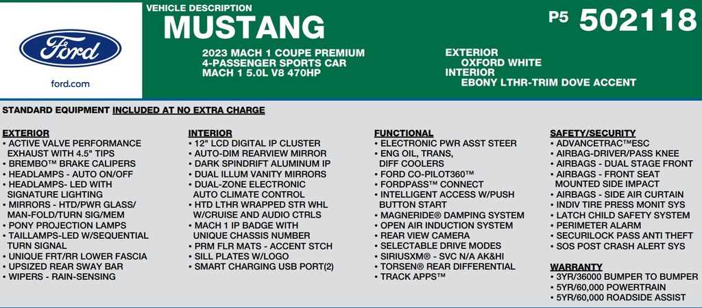 The Mach 1 Handling Package takes this Mustang to new heights, offering enhanced performance and handling capabilities that will leave you in awe. Indulge in the convenience of features like Heated Steering Wheel, Climate Controlled Heated/Cooled Front Seats, and Exterior Parking Camera Rear, all designed to elevate your driving experience.