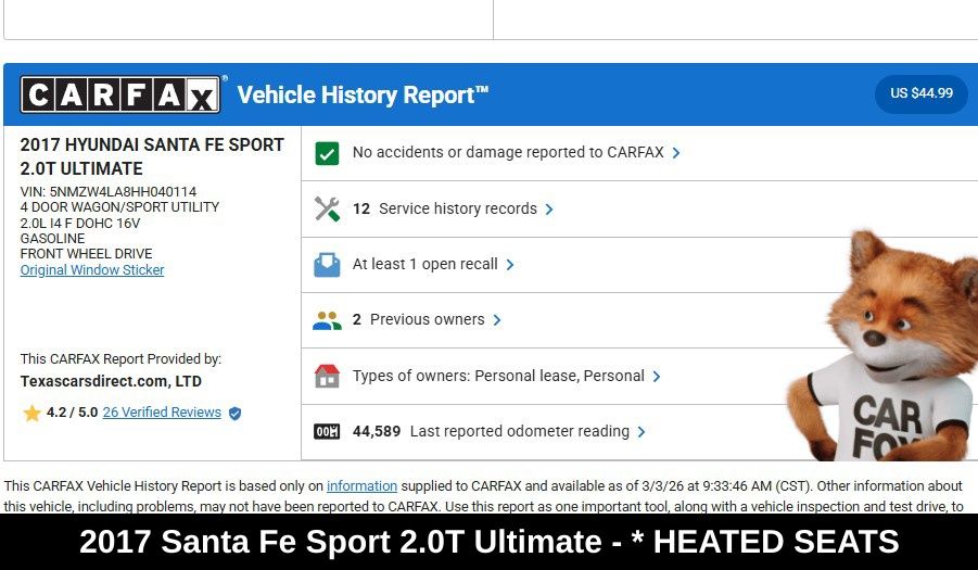 This Santa Fe Sport 2.0T Ultimate is powered by a 2.0-liter turbocharged engine that delivers an impressive 240 horsepower, paired with a smooth-shifting 6-speed automatic transmission. With an EPA-estimated 20 city/27 highway mpg, you'll enjoy the perfect balance of power and efficiency.