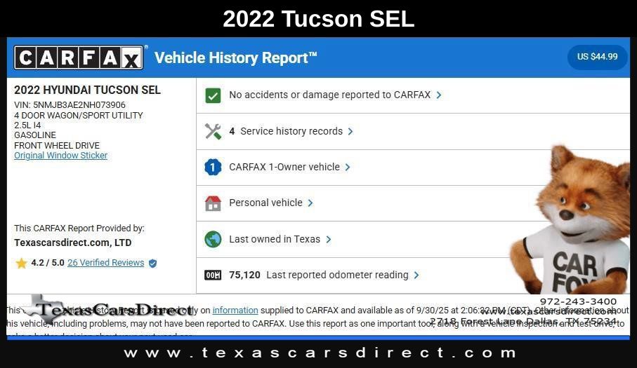 This 2022 Hyundai Tucson SEL, has Phantom Black exterior and Black interior color. 76,012 miles. Stock Number 073906. You can connect with us by calling 972-243-3400.
