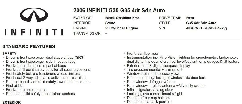 This 2006 INFINITI G35 Sedan Base, has Black Obsidian exterior and Stone interior color. 141,992 miles. Stock Number 505492. You can connect with us by calling 972-243-3400.