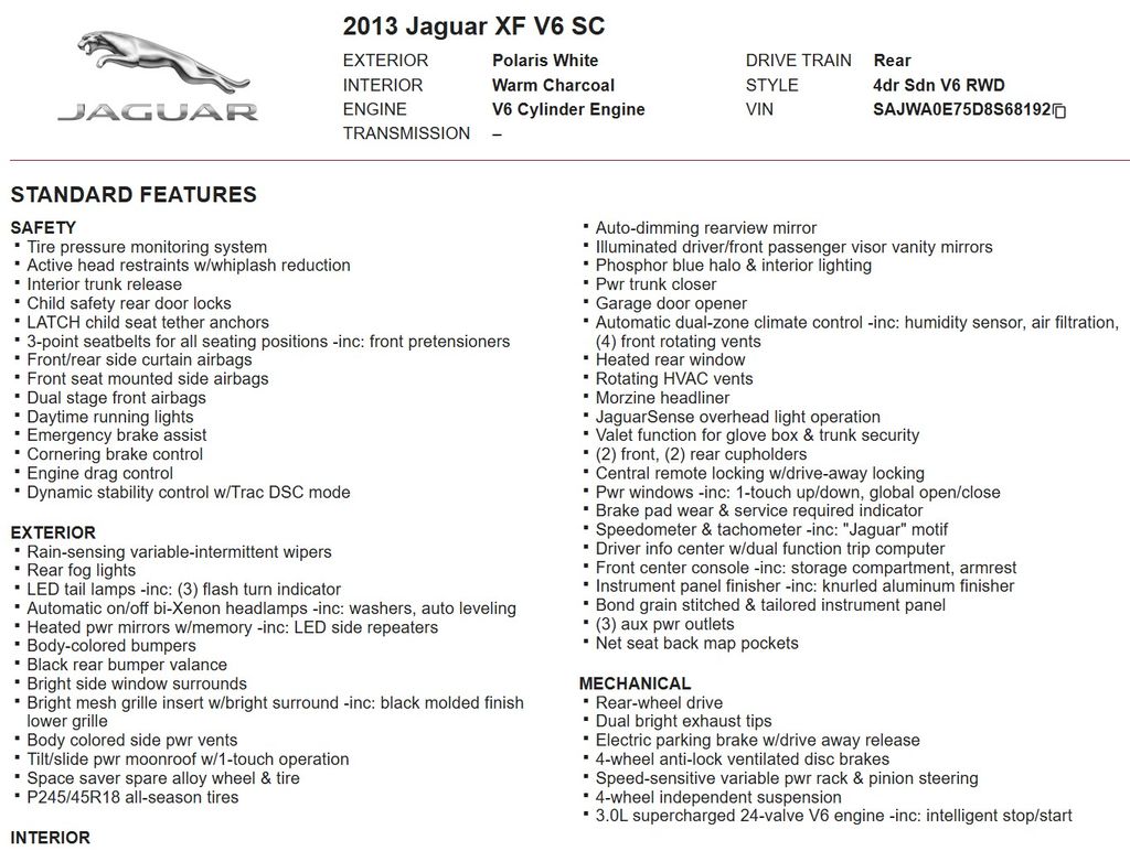 Discover the refined elegance and exceptional performance of this 2013 Jaguar XF V6 SC LOW MILE CLEAN CARFAX/PREMIUM/PORTFOLIO PKG. This captivating Jaguar boasts a stunning White exterior, complemented by a meticulously maintained interior that exudes sophistication.