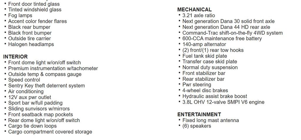 This Wrangler is powered by a reliable 3.8L V6 SMPI engine paired with a 4-speed automatic transmission, delivering a smooth and capable driving experience. With its 4WD system and impressive off-road capabilities, you'll be able to conquer any terrain with confidence.