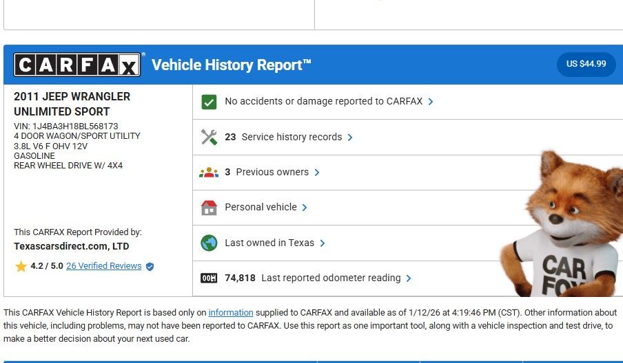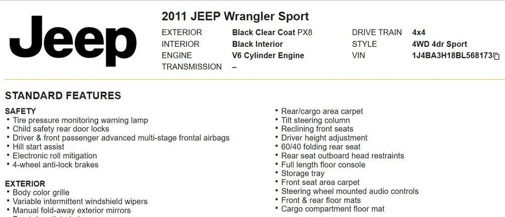 I really do love my 2011 Jeep Wrangler Sahara Unlimited. I have been so pleasantly surprised at how great it handles and the tork and power it has. I wish I could keep it but I've got to have a big vehicle with alot of extra storage space for my business as a contractor as well as a musician that has to haul drums,a keyboard and a small PA system. Putting the back seats down flat does give me plenty of room for my 5 pc. drum kit w/cases but not for the rest of my equipment. I just can't afford 2 car payments either. I love the way my Jeep looks inside, the great stereo, the incredible heat and air conditioning, comfortable seats, the grip of the steering wheel in my hands and especially the tough and rugged outside appearance yet with a touch of elegance with the silver hardtop and 18” alloy wheels. Plus I've always wanted a Jeep since I was about 17yrs.old. Oh well, anyway...no complaints. Oh,by the way, the miles I put on the vehicle are almost entirely highway miles that I would have to travel in my business. I'm just looking for a good home and grateful, conscientious owner like I've been for my Wrangler. I'm also gonna miss the hand waves and acknowledgments from all my fellow Jeep buddies as we drive down the road. If you already own a Jeep you know what I'm talking about. If not...welcome to the Family! : )