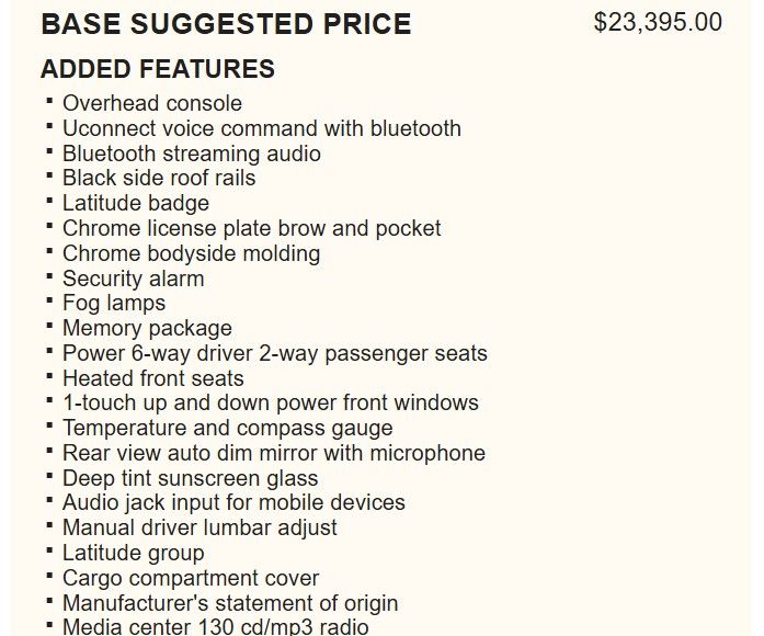 This Liberty also boasts a Memory Package, providing personalized settings for the driver's seat, mirrors, and steering wheel. The Latitude group adds premium touches like chrome bodyside molding, a leather-wrapped steering wheel, and an auto-dimming rearview mirror with microphone.
