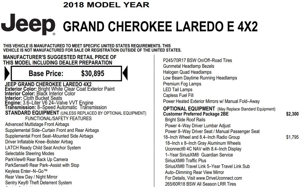 Other standout features include a power 8-way driver's seat, a power 4-way driver's lumbar adjustment, bright side roof rails, and a rear-view auto-dimming mirror. The Jeep Grand Cherokee Laredo E also boasts a suite of advanced safety technologies, such as ParkView Rear Back-Up Camera, Rear Parking Sensors, and Electronic Stability Control.