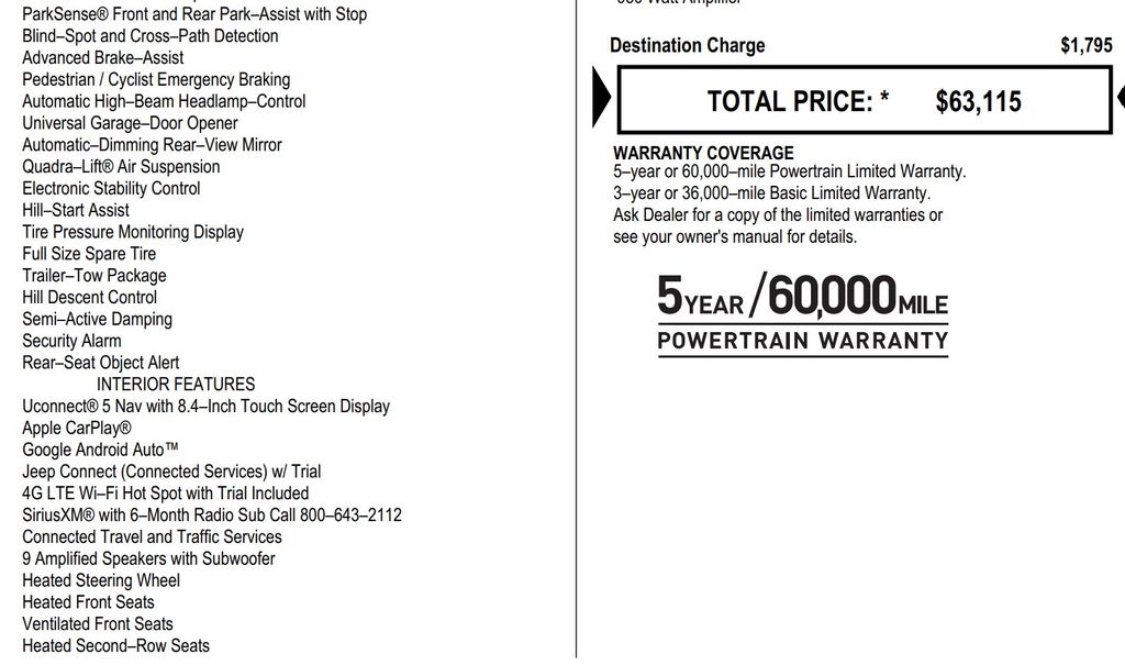 Step inside and be captivated by the luxurious Nappa leather-trimmed interior, complete with heated and ventilated front seats, a heated steering wheel, and a stunning 10.1-inch touchscreen display with the cutting-edge Uconnect 5 infotainment system. Enjoy the premium 19-speaker audio system and the convenience of Apple CarPlay and Android Auto integration.