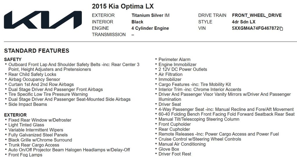 Discover the joy of driving with this meticulously maintained 2015 Kia Optima LX. Visit our showroom today and experience the difference for yourself. We're confident you'll be impressed by this exceptional vehicle and our commitment to your satisfaction.