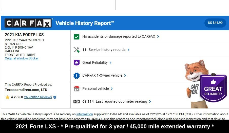 - Pre-qualified for 3 year / 45,000 mile extended warranty