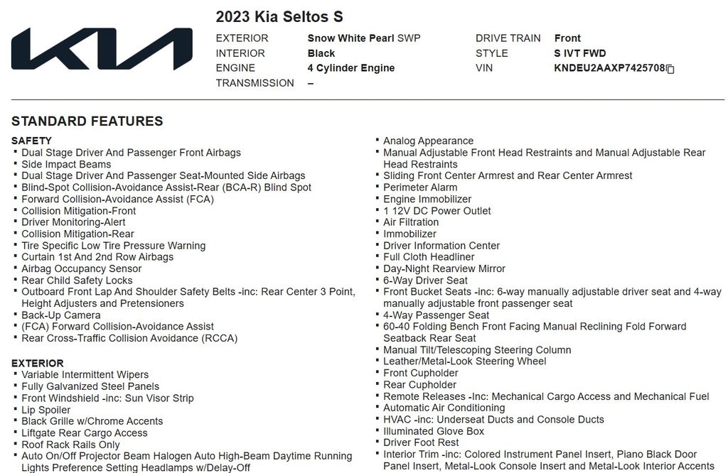 Experience the perfect blend of style, technology, and efficiency in the 2023 Kia Seltos S. This compact SUV is a true standout, offering a captivating design, advanced features, and impressive fuel economy that will elevate your driving experience.