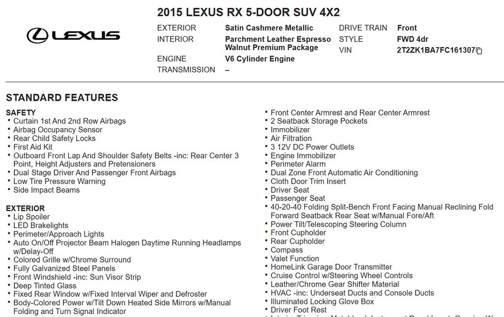 We are confident that this 2015 Lexus RX 350 PREMIUM PKG/HTD-COLD SEATS/INTUITIVE PARK ASSIST will exceed your expectations and provide you with the exceptional driving experience you deserve. We invite you to schedule a test drive and experience the unparalleled luxury and performance of this remarkable Lexus.