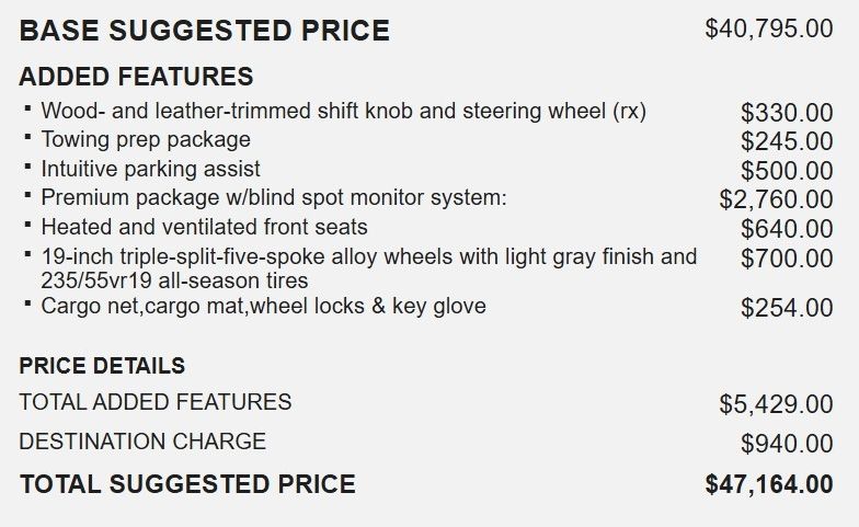 I enjoy the comfort, heated seats, drop down sideview mirrors when in reverse-needs a better console-very cheap for a $45,000 vehicle - 5.0