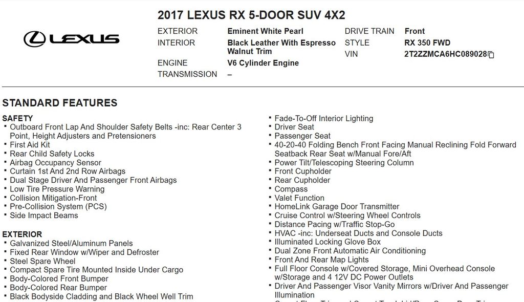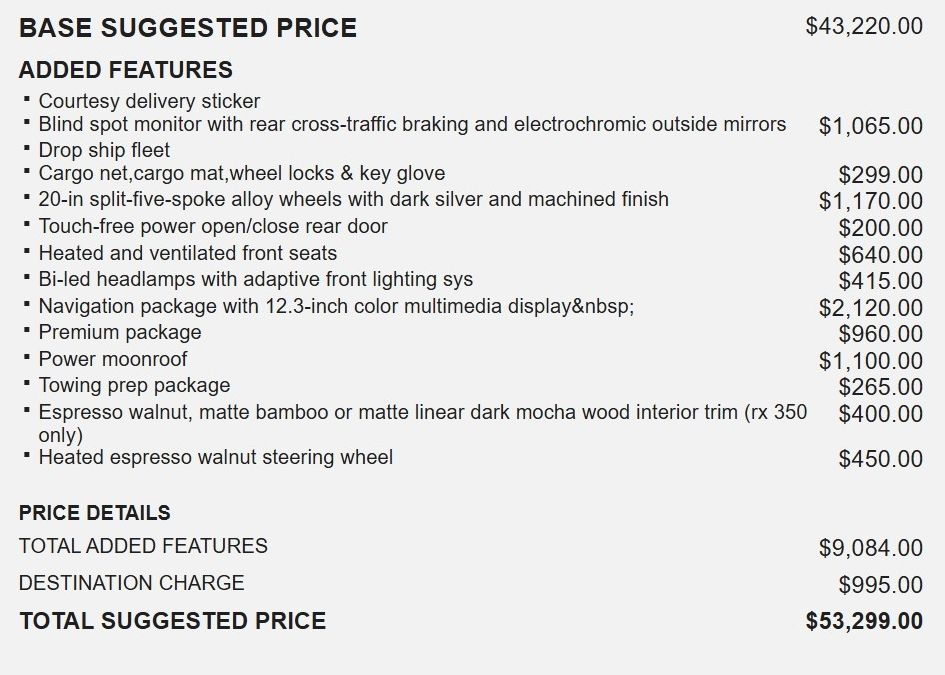 I recently purchased my RX350 from a local dealer. Best purchase I have ever made. High level of standard features. Very well laid out interior ( much better than BMW X3) which felt like driving a doctors office. - 4.0
