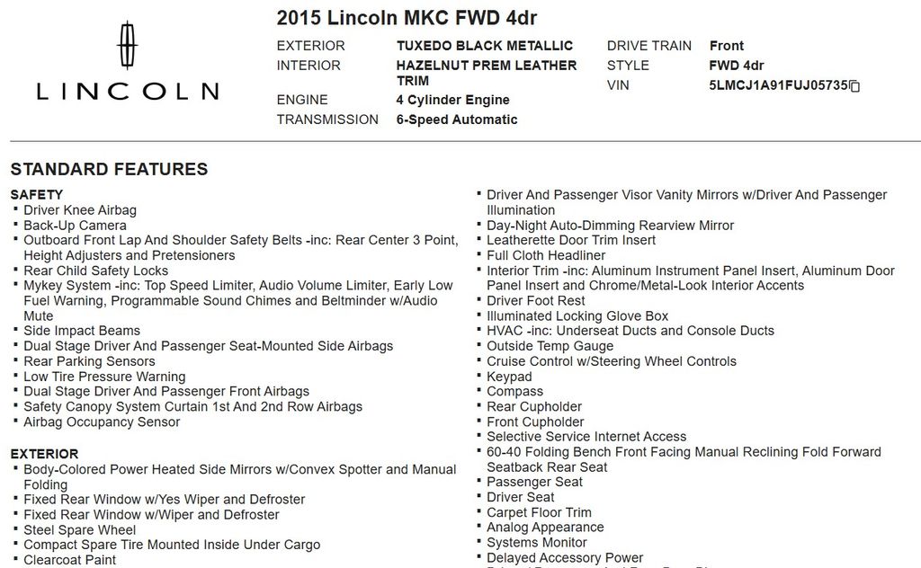 2015 Lincoln MKC Base Reserve PKG/Pano/HTD-Cold Lthr/Blind Spot