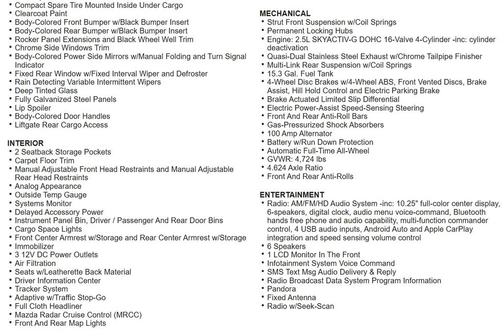 - Adaptive Cruise Control: Mazda Radar Cruise Control (MRCC)