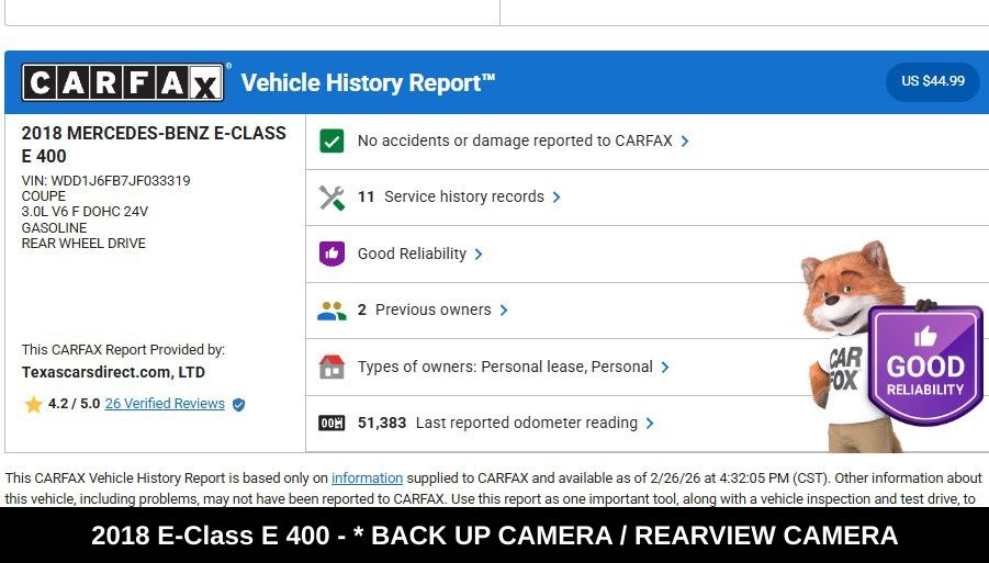Indulge in the epitome of luxury and performance with this remarkable 2018 Mercedes-Benz E-Class E 400 COUPE. This meticulously maintained, low-mileage vehicle boasts a clean CARFAX history, ensuring you can trust its exceptional condition. Adorned in a sleek and sophisticated Red exterior, this E-Class Coupe is a true head-turner, commanding attention wherever it goes.