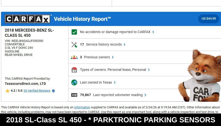 This 2018 Mercedes-Benz SL-Class SL 450 is a true testament to German engineering and design. With its impeccable CARFAX history and meticulously maintained condition, it's the perfect choice for the discerning driver who demands the best. Don't miss your opportunity to experience the exceptional performance and unparalleled luxury of this remarkable vehicle.
