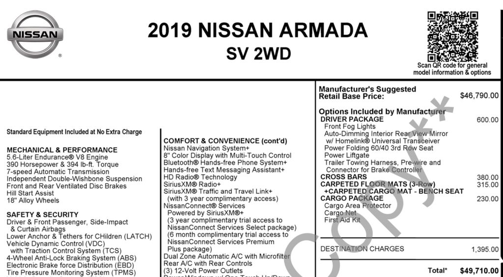 Don't miss your chance to experience the exceptional performance and unparalleled features of the 2019 Nissan Armada SV. Visit our showroom today and let our knowledgeable sales team guide you through all the details that make this vehicle a true standout in its class.