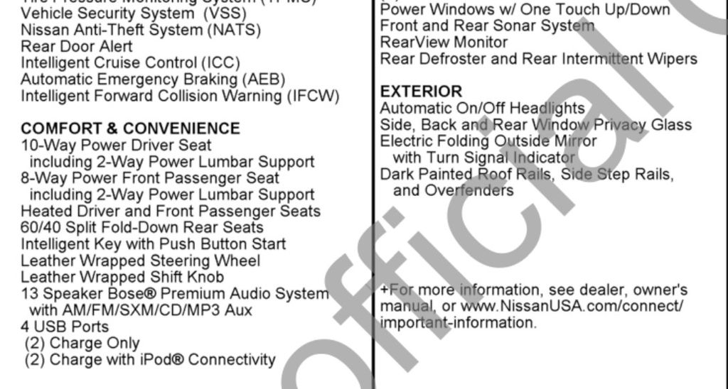 This has been my first experience with an SUV and I’m smitten. This vehicle is incredible, and I’m proud to use it in any situation, because it always impresses. It handles like a dream and is comfortable, as well as fully loaded (platinum reserve) edition. There are so many upgrades on this vehicle that I’m always wondering where do you go after owning one, I’m so spoiled by it. If I had to pick a downfall it would be the mileage, although I get on average 17 miles per gallon in town and I’m alright with that. The ability to transport anything I want makes owning it worth it. I love my first Nissan, I love this vehicle. - 4.0