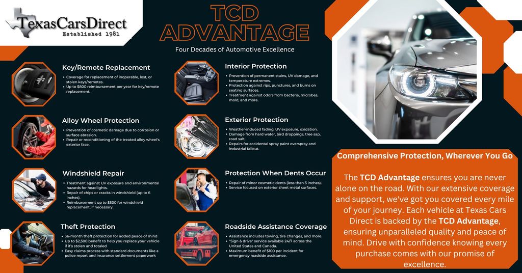 Sale Price plus TCD Advantage Program ($1,495) protecting your vehicle wheels against curb rash, windshield cracks, chips, or up to $500 toward replacement, interior stains and tears, exterior paint protection against environmental hazards, paintless dent repair, and roadside assistance!