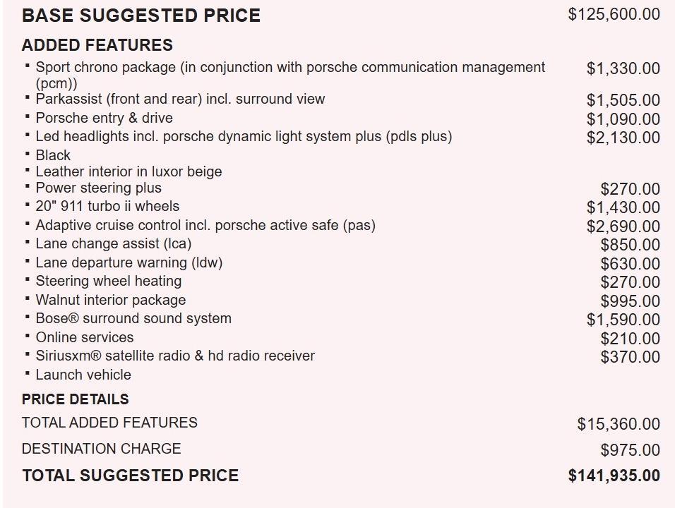 WHEELS: 9.5J X 20 FR & 11J X 20 RR 911 TURBO II, POWER STEERING PLUS, LED HEADLIGHTS W/PORSCHE DYNAMIC LIGHT SYSTEM PLUS, BOSE SURROUND SOUND-SYSTEM, PORSCHE ENTRY & DRIVE, SPORT CHRONO PACKAGE, ADAPTIVE CRUISE CONTROL W/PORSCHE ACTIVE SAFE, BURR WALNUT INTERIOR PACKAGE, LANE CHANGE ASSIST (LCA), LANE DEPARTURE WARNING (LDW), ONLINE SERVICES, REVERSING CAMERA W/FRONT & REAR PARKASSIST