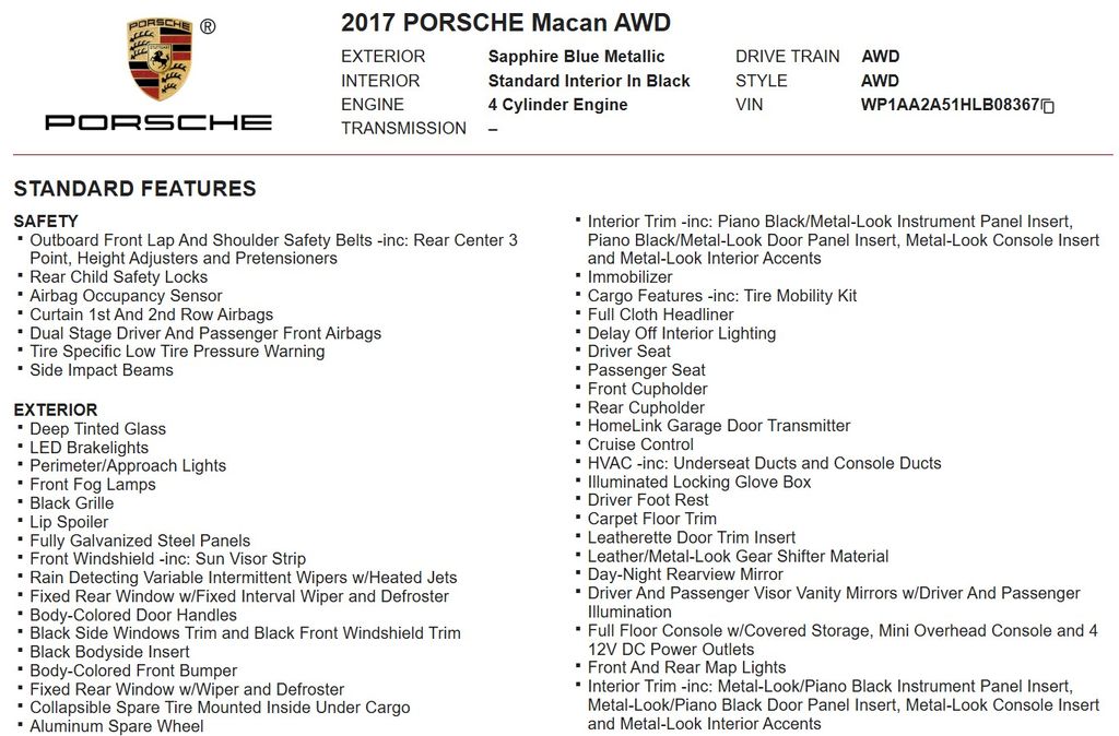 This 2017 Porsche Macan Base AWD is a remarkable opportunity to own a premium SUV that combines power, practicality, and unparalleled Porsche craftsmanship. With a clean CARFAX and a host of desirable features, this Macan is ready to elevate your driving pleasure.