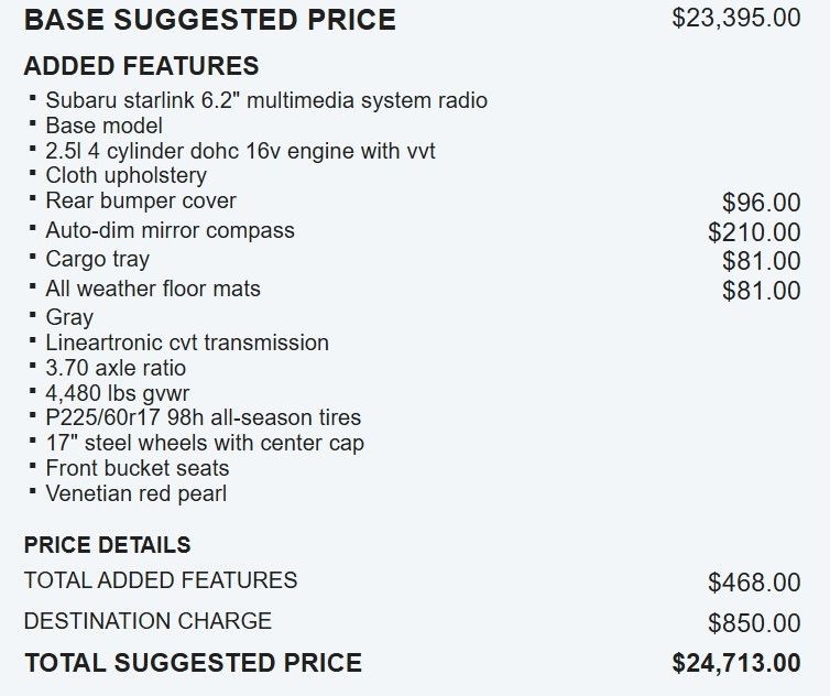 Inside, you'll find a wealth of features that enhance your driving experience, including power windows, telescoping steering wheel, and a Subaru Starlink 6.2" multimedia system with AM/FM radio, CD player, and Bluetooth connectivity. The spacious cargo area and 60/40 split-folding rear seats offer exceptional versatility, making it easy to accommodate your gear and passengers.