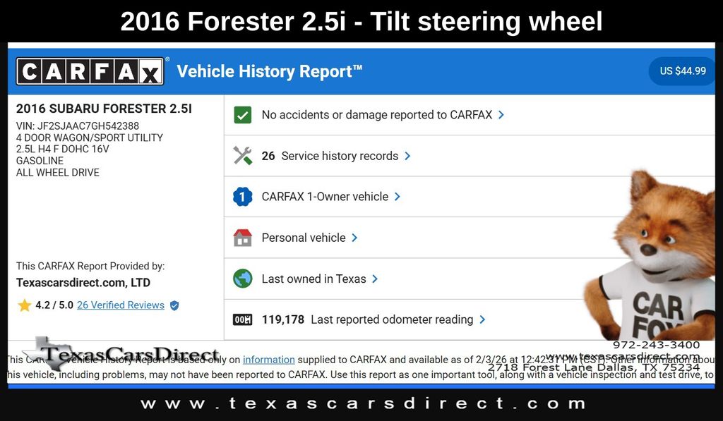 This 2016 Subaru Forester 2.5i 1-OWNER CLEAN CARFAX/CAMERA/BLEUTOOTH is an exceptional value, offering the perfect blend of practicality, performance, and style. Visit our showroom today to experience it for yourself and discover why this Forester is the ideal choice for your next vehicle.