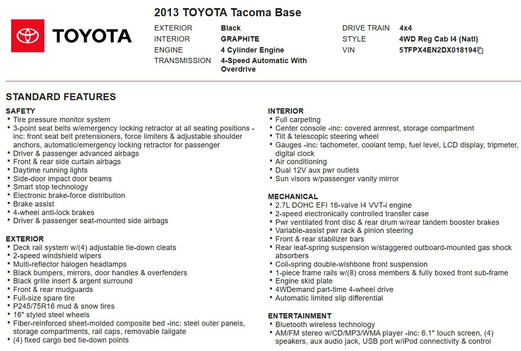 Discover the rugged capability and reliable performance of this 2013 Toyota Tacoma Base 2.7L REGULAR CAB 4WD with a CLEAN CARFAX. This versatile pickup boasts a powerful 2.7L I4 DOHC 16V engine paired with a 4-speed automatic transmission, delivering an impressive 18 city/21 highway MPG.