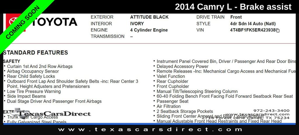 This Camry also comes equipped with a comprehensive suite of safety features, including: