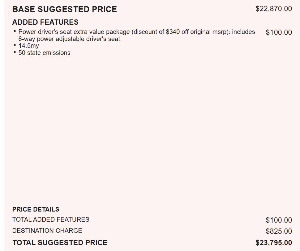 Sale Price plus TCD Advantage Program ($995) protecting your vehicle wheels against curb rash, windshield cracks, chips, or up to $500 toward replacement, interior stains and tears, exterior paint protection against environmental hazards, paintless dent repair, and roadside assistance!