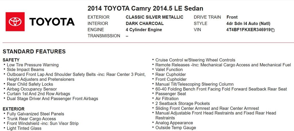 Don't miss your chance to own this exceptional 2014 Toyota Camry LE. With its impressive fuel efficiency, advanced technology, and wealth of premium features, this Camry is a true value proposition in the midsize sedan segment.