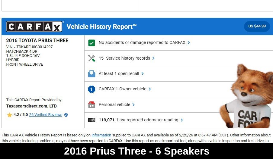 Experience the perfect blend of efficiency, technology, and style with this 2016 Toyota Prius Three. We offer free Carfax vehicle history reports on our website, so you can be confident in your purchase.