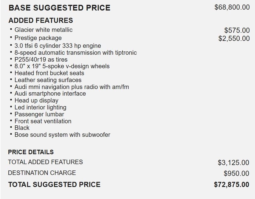 The Prestige Package takes this A7 to the next level, offering exclusive features like power-closing doors, front seat ventilation, passenger lumbar support, LED interior lighting, and a cutting-edge Head-Up Display that projects vital driving information directly into your line of sight. The stunning Glacier White Metallic exterior is complemented by the premium Audi Guard All-Weather Floor Mats and a set of high-quality USB cables, ensuring your every need is met.